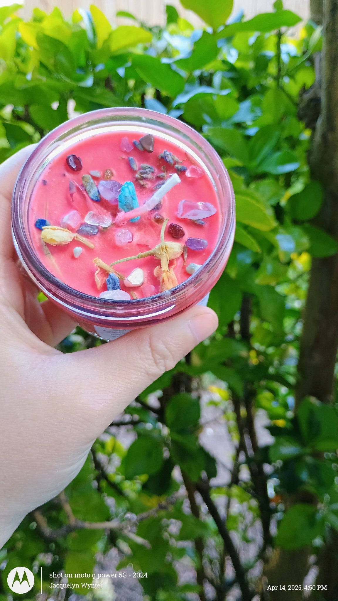 Hand-poured in a small glass jar, it’s blended with Rosemary, Chamomile, Sandalwood, Vanilla, Lavender, Cedar, and Rose essential oils, then topped with dried herbs, flowers, and energy-charged gemstones for a full heart-healing experience. Let the flame speak for your heart