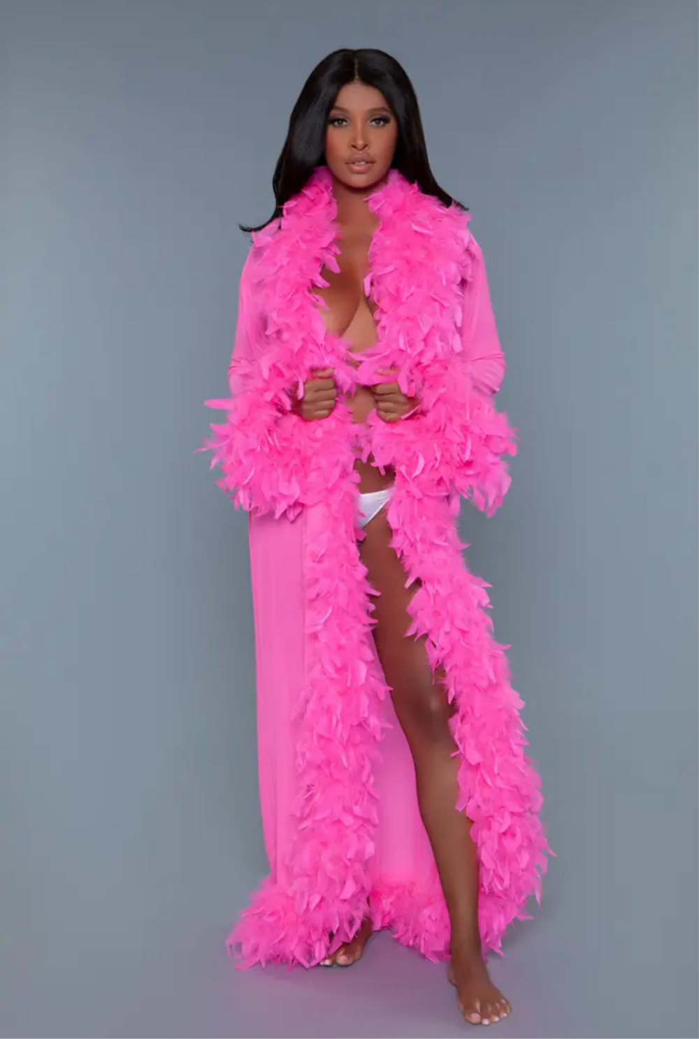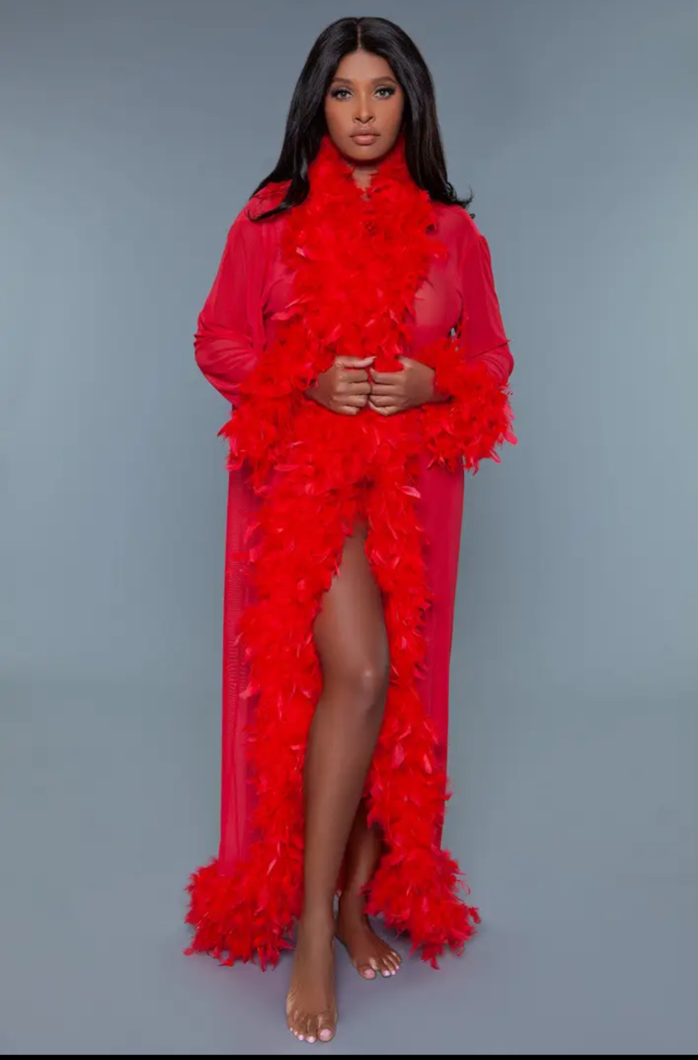 Long Glamour robe with feather boa trim is a playful yet elegant garment that combines the airy lightness of chiffon with the whimsical allure of a feather boa trim. This robe adds a touch of sensuality and allure to your lingerie wardrobe, making it a must-have robe.