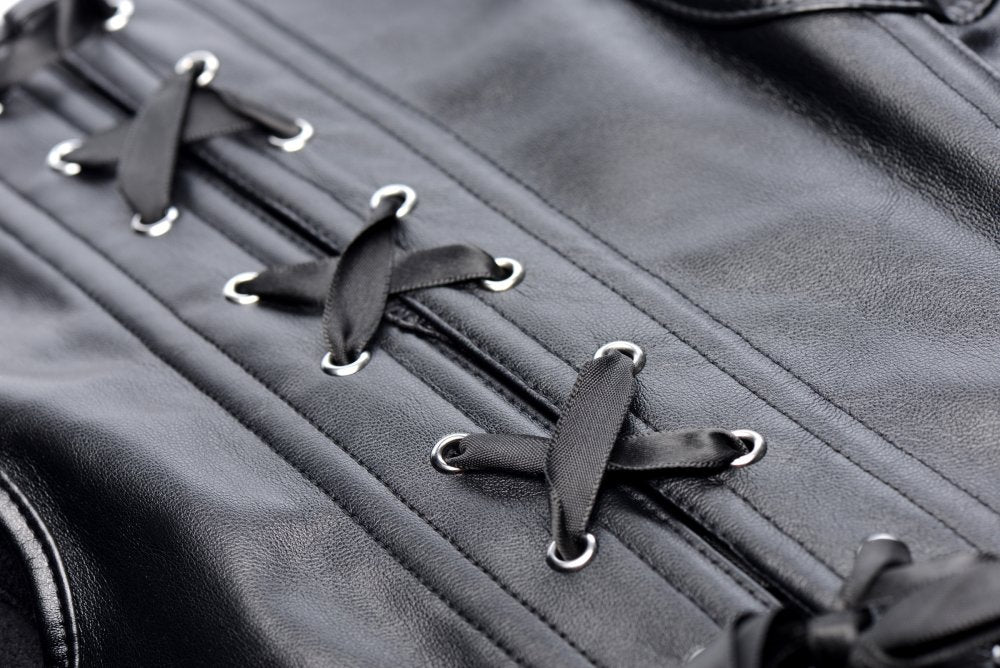 Adopt the domineering aesthetic of a leather mistress with this Lace Up Corset Vest and Thong! Crafted to provide a satisfying hug on your body without discomfort while also displaying a striking silhouette to portray an authoritative persona to fill you with confidence. Lace up, accentuate your curves, and show off your dark side!