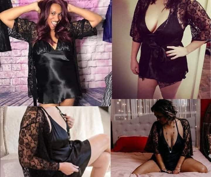 Three- pieve set includes robe, babydoll dress, and matching thong, plus hanger. Ideal for the woman who craves luxury.