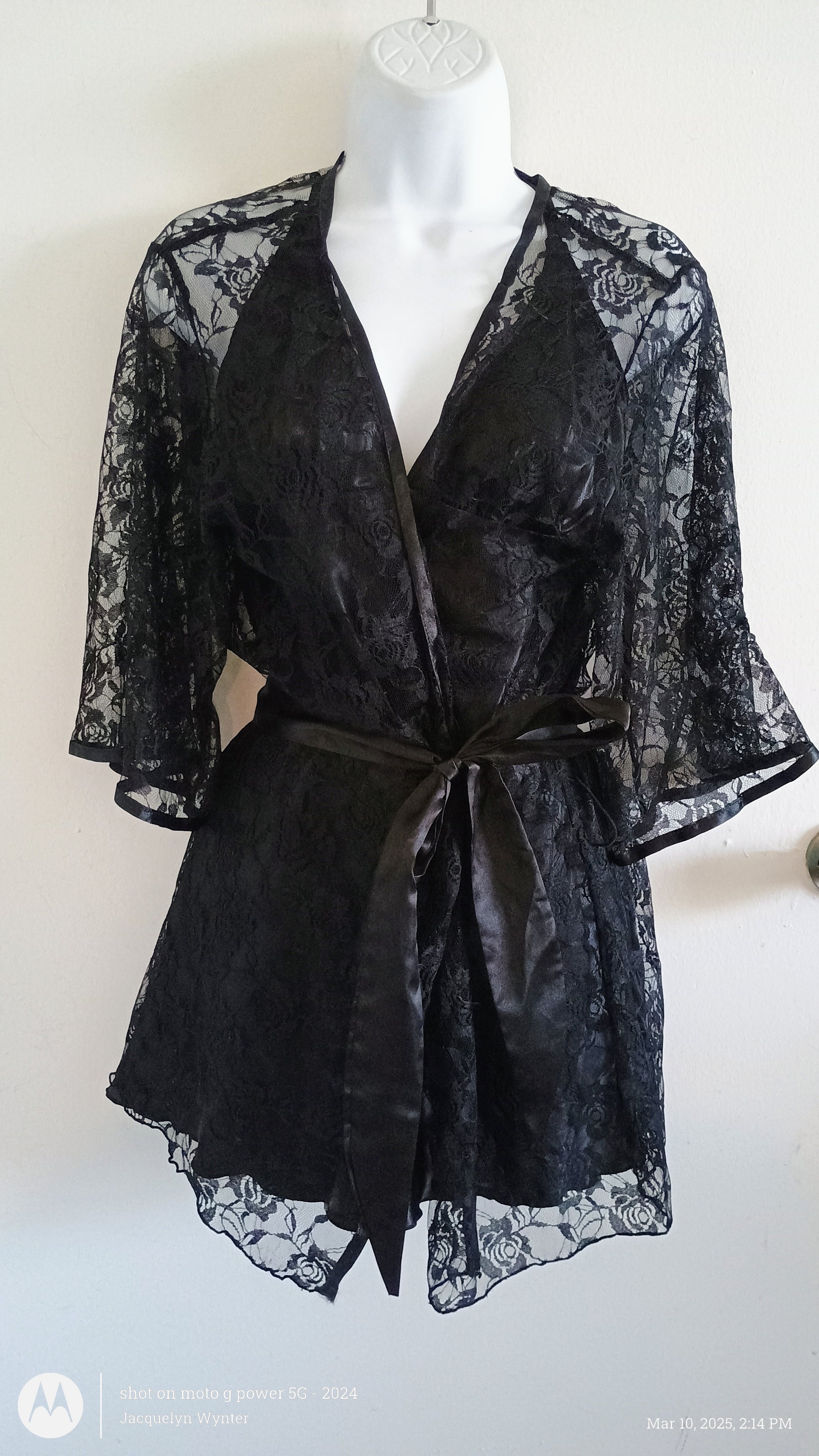 When the sun goes down, it's time for romance and Twilight. The black floral lace lingerie robe stays closed with a silky tie that just begs to be undone; open up the robe to expose the charmeuse bias-cut babydoll with crisscross adjustable straps, sexy low back, and side-slit hem. This sexy black lingerie includes a thong and a hanger.
