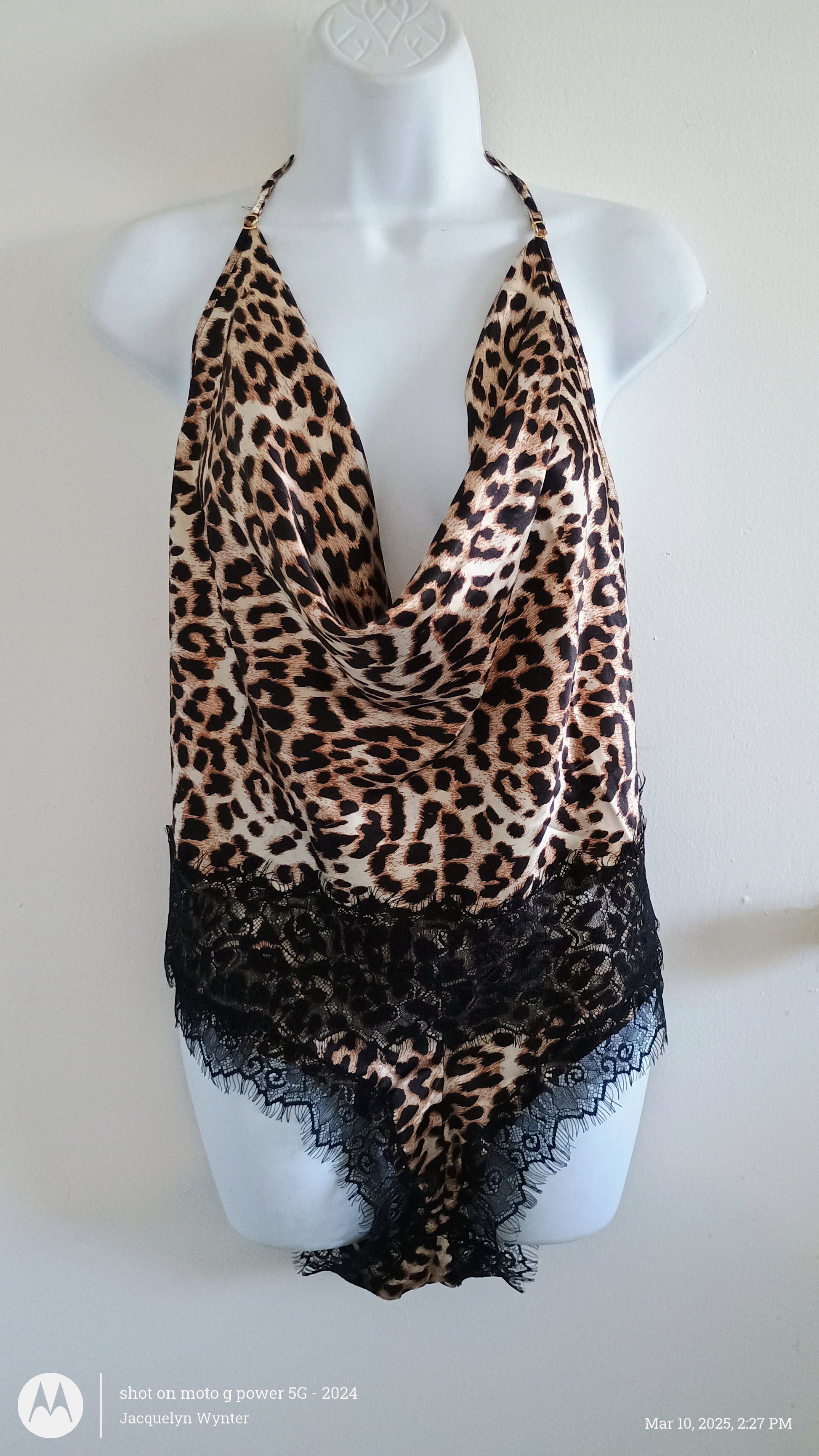 ● Satin, animal print set with contrasting, eyelash lace trim
