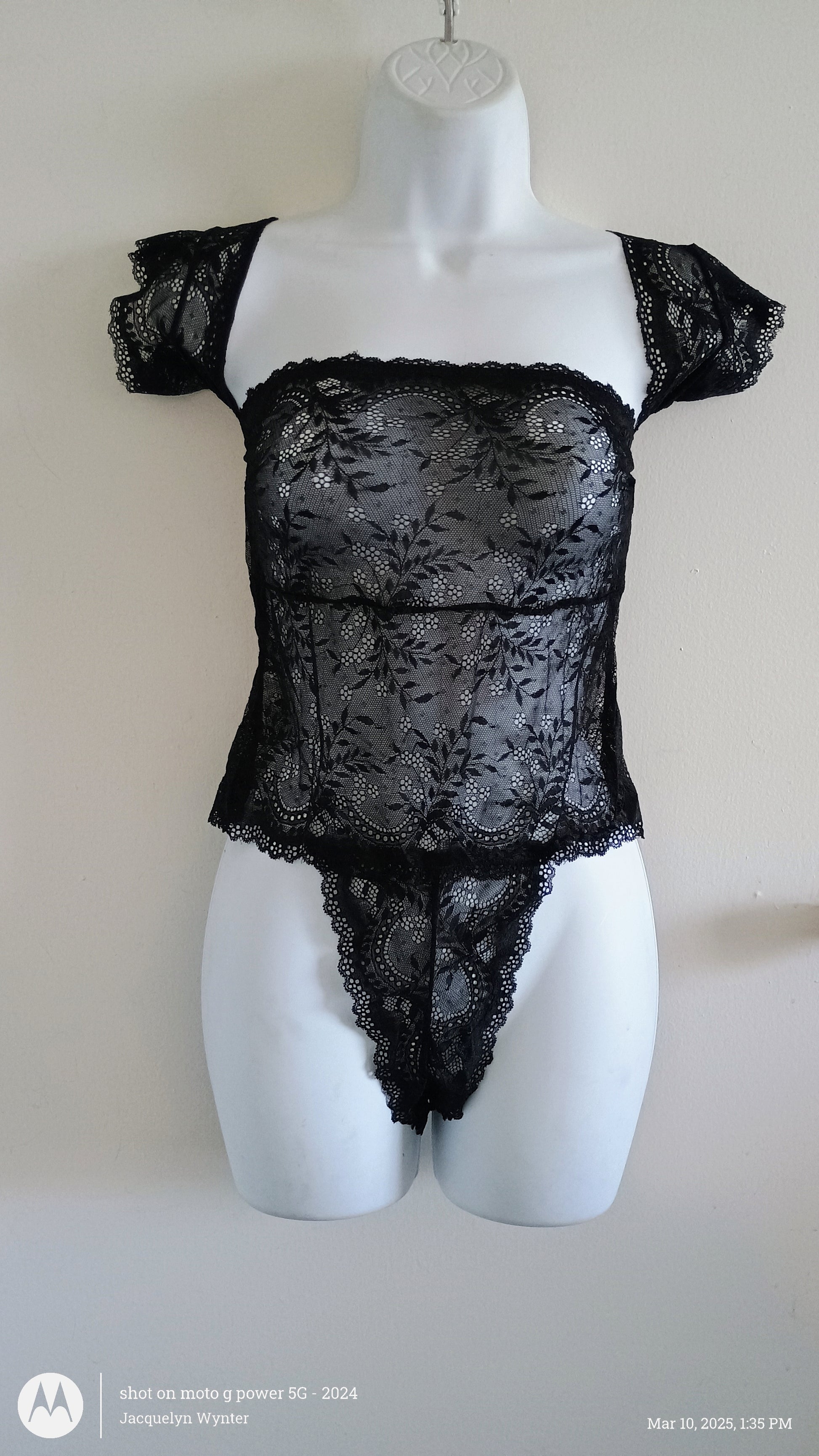 Be sweet but seductive in this lingerie set. Wear it under your favorite date night outfit as a sexy surprise they won't forget. The high-cut style bottom shows off your curves in the best way, while the lace arm cuffs add a touch of romance.