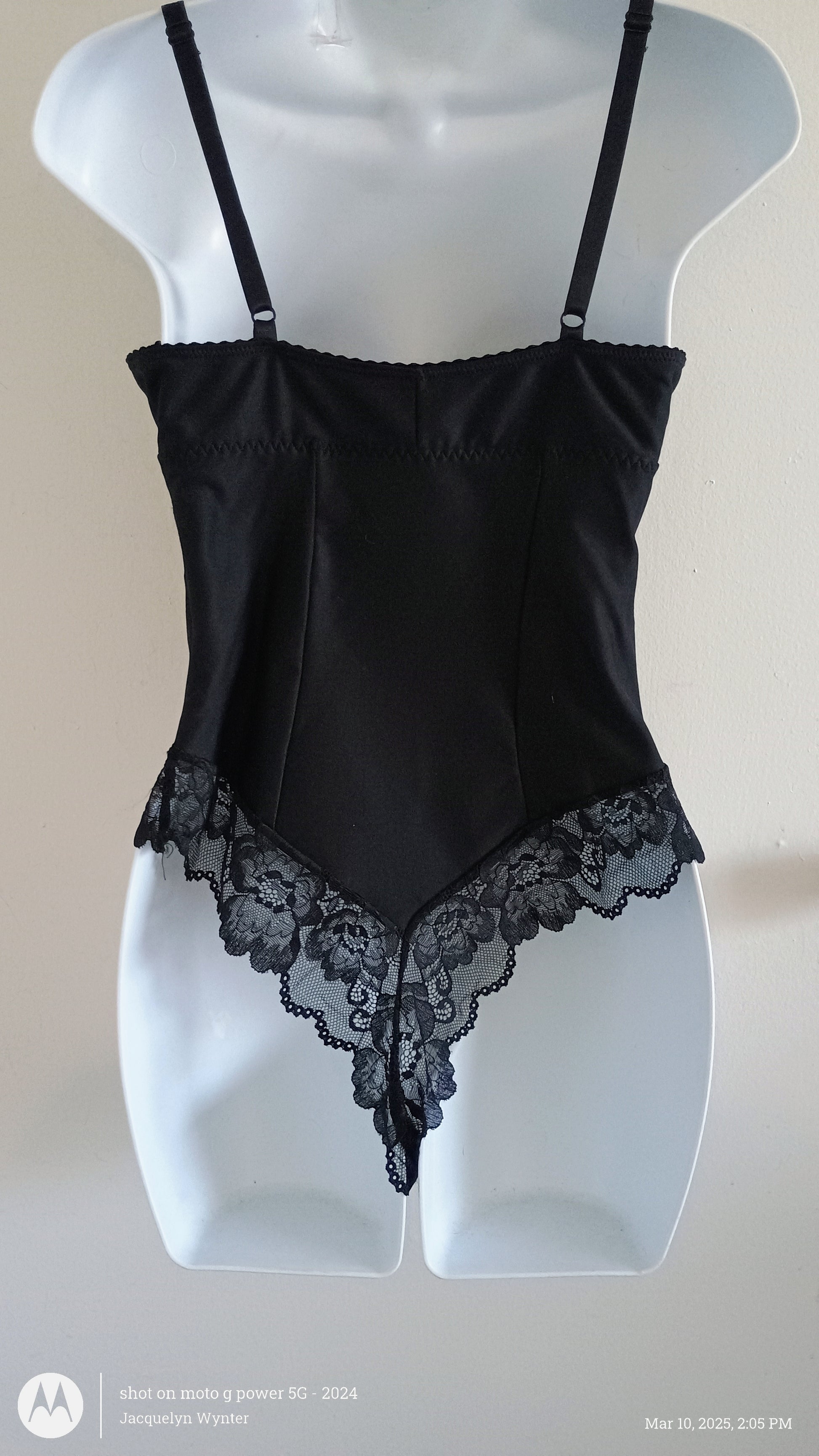 Thicker sculpting material is comfortable, stretchy, and slimming. Shaping material smooths your stomach and hips. Underwire and lace shape and show off your bustline. Adjustable straps help make for a perfect fit. Adjustable hook and eye bottom closure in panty area. Low neckline and back allow this to be worn with a variety of clothing.
