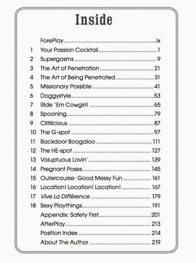 A truly modern communication tool, this gem of a book empowers women and men to experience the best lovemaking of their lives. By renowned sexologist, Dr. Sadie Allison. Over 500,000 Copies Sold! Bestseller and Independent Publishers Best Sexuality Book Award (IPPY) Winner. * Over 100 titillating "point-n-play" position illustrations to spice up your lovemaking * Discover all the strokes, squeezes & sensations your lover wants (but isn't telling you) * Arousing penis thrills to give her ohmigod! orgasms during intercourse * Secret touches to set off eye-popping G-spot & HE-spot (prostate) climaxes * Learn your own custom-fit with your lover for the most satisfying lovemaking ever