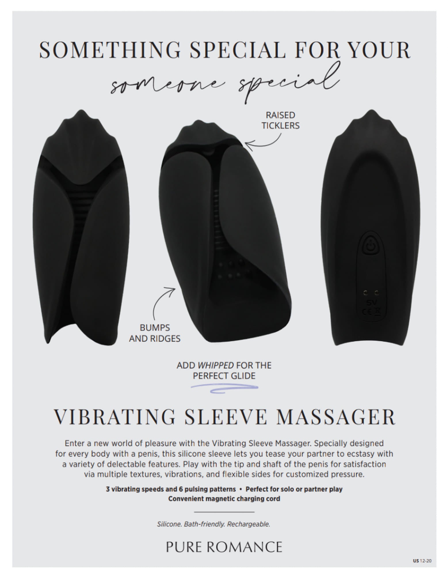 Enter a new world of pleasure with the Vibrating Sleeve Massager. Specially designed for everybody with a penis, this silicone sleeve lets you tease your way to ecstasy with a variety of delectable features, including 3 different textures—bumps just inside the opening, ridges along the middle, and raised ticklers at the top. And that’s just the start! This massager has multiple textures, vibrations, and flexible sides for customized pressure. Add Whipped for the perfect amount of glide and use the sleeve to play with the tip and shaft of the penis for satisfaction, solo or with a partner.
