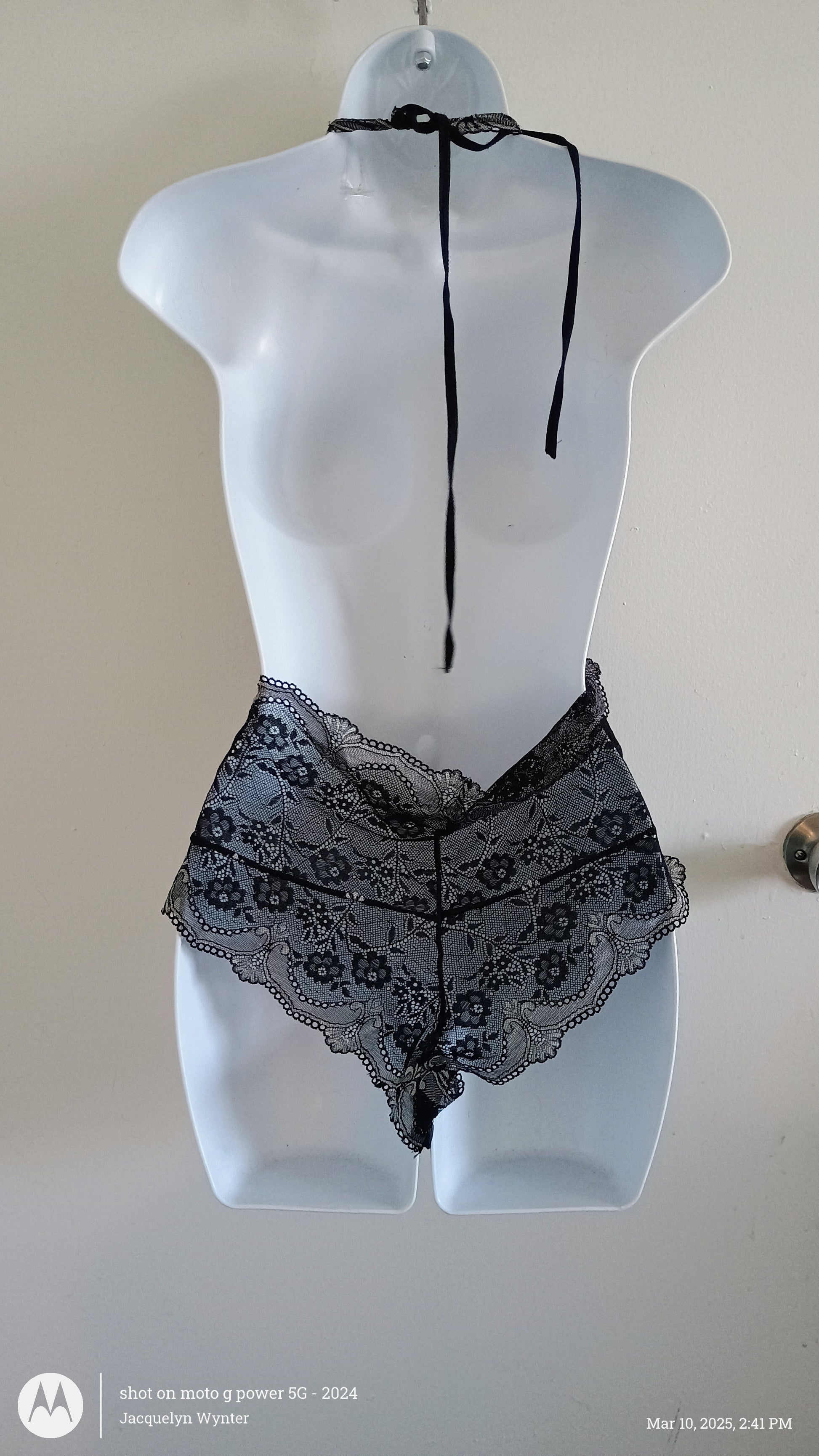 Black lace with floral detailing. Deep V-Neck with halter tie. Scalloped silver trim. Flattering low back.