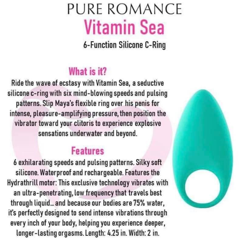 Vibrating C-ring | Ride the wave of ecstasy with Vitamin Sea, a seductive silicone c-ring with 12 mind-blowing speeds and pulsing patterns. Slip Vitamin Sea’s flexible ring over the penis for intense, pleasure-amplifying pressure, and position the vibrator toward the clitoris to experience explosive sensations underwater and beyond.